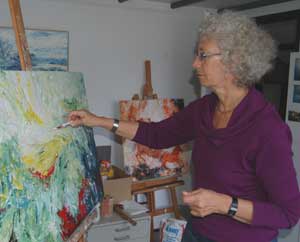 | Later heeft zij vele jaren lesgegeven bij Effatha:in het voortgezet dovenonderwijs. Vanaf 1991 heeft zij vijf jaar schilderles gehad aan de vrije academie in Den Haag. Van 2000 - 2006 had zij een galerie in Delft waar zij haar eigen werk en dat van anderen exposeerde. Na een periode van schilderen in olieverf op linnen heeft zij nu een vrijere stijl ontwikkeld met andere materialen zoals: hout, ruwe stof, draden, geroest metaal, lood, verdikkingsmiddel en vele lagen acrylverf. Zij bewerkt haar tevoren geïmpregneerde doeken of panelen met een laag verdikkingsmiddel, dat met water is aangemaakt. Dit wordt dan spontaan over het op de grond liggende doek/paneel uitgegoten. Hierna schildert ze met een groot penseel of met een paletmes de pasta met verschillende acrylkleuren op het doek. Met dunnere penselen of paletmessen wordt dan het schilderij verder uitgewerkt. De herhaaldelijk overgeschilderde lagen verhogen de expressie en er ontstaat dan een mysterieuze sfeer door deze transparante glacé. Uiteraard spelen haar eigen intuïtie en spontaniteit een belangrijke rol. Marry Feldmeijer geeft ook les in haar atelier aan kleine groepen. Klik hier voor meer informatie. |